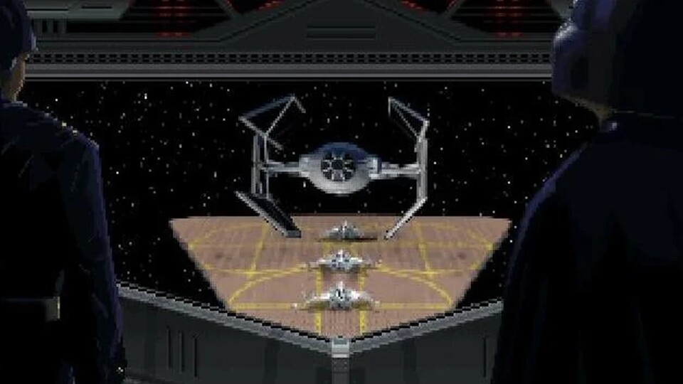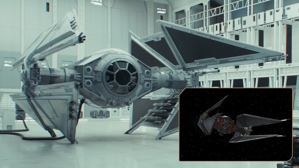 古い LucasArts ビデオ ゲームの TIE アベンジャー…そしてカイロ レンの TIE ウィスパーと直接比較したアンドールの TIE アベンジャーズ。画像出典: ディズニー/ルーカスフィルム